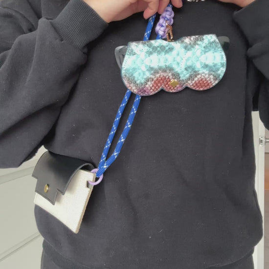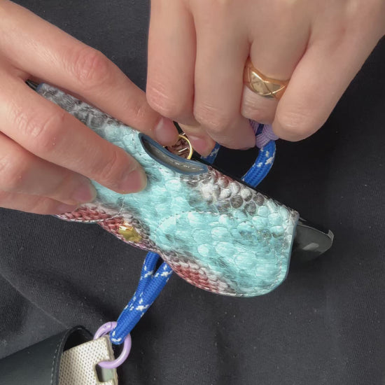 - Features an extra clasp to clip your charm-case, keys, or mini pouch.